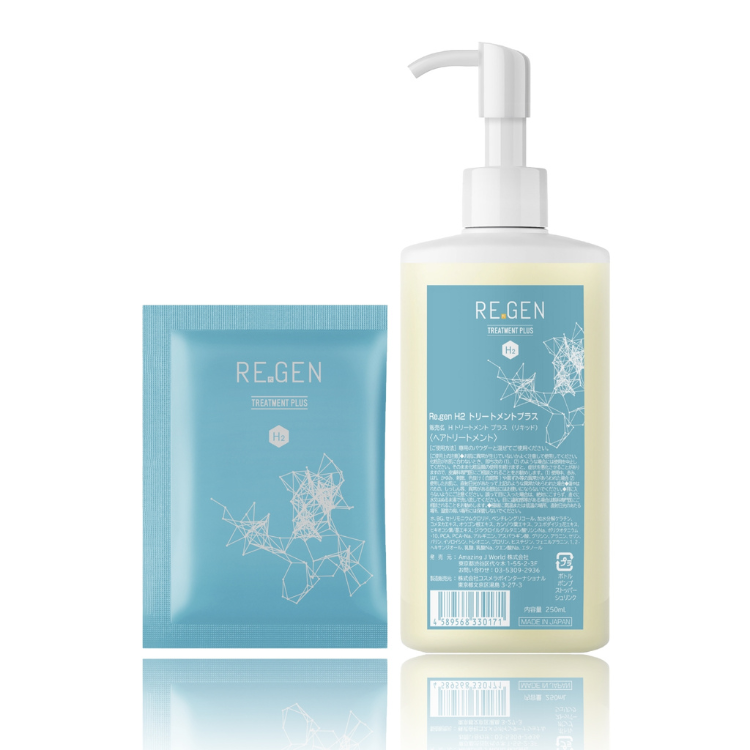 水素はカラダ中の活性酸素を除去し健やかな状態へ導く力があります。パーマ・カラーリングの際には大量の活性酸素が発生するため、放っておくとヘアダメージや白髪の原因に。水素トリートメント「REGEN H2 トリートメント プラス」は水素水や水素サプリメントとは違い、髪・頭皮に直接水素を送り込み集中的にダメージダメージ補修することができる新発想の水素トリートメントです。